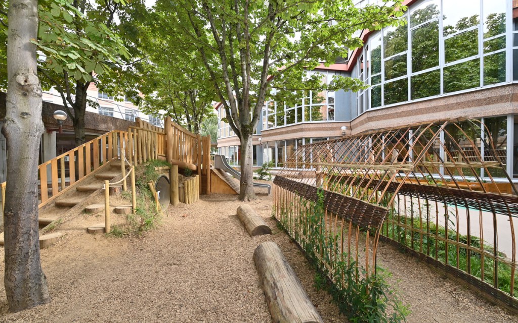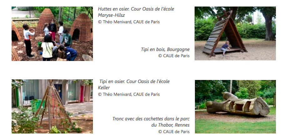 Exit la mono-activité, les nouvelles cours sont plurielles et ont vocation à susciter la curiosité à travers de multiples usages. Un mur au fond de la cour se mue en une mini via ferrata, un coin isolé en une butte montée d’un toboggan, les espaces végétalisés deviennent accessibles aux enfants pour y observer la nature, créer un potager ou se cacher dans un tipi en bois. Une étude canadienne menée à Toronto a d’ailleurs montré que la diversité des espaces de jeux dans ce type de cours permettaient de réduire les tensions entre les élèves (6). Cette même étude met en exergue le caractère inclusif de ces cours, indépendamment du genre, de la couleur de peau des enfants, de leur classe sociale ou de leurs capacités intellectuelles. Les professeurs observent une réduction des conflits grâce à la multiplicité d’activités permises dans la cour qui stimulent à la fois la créativité, la motricité des enfants et leurs capacités sensorielles. Plus encore, selon une étude finlandaise (7), renforcer la biodiversité dans les cours permettrait d’améliorer les défenses immunitaires des enfants, grâce à une stimulation de la microbiote au contact de la nature. Dans ces cours végétalisées, les enfants peuvent toucher (l’eau, les feuilles, le bois), gratter (la terre, le sable), sentir (l’herbe, les fleurs…), transvaser (du sable, des gravillons, de l’eau) et grimper, courir, se reposer, se cacher.